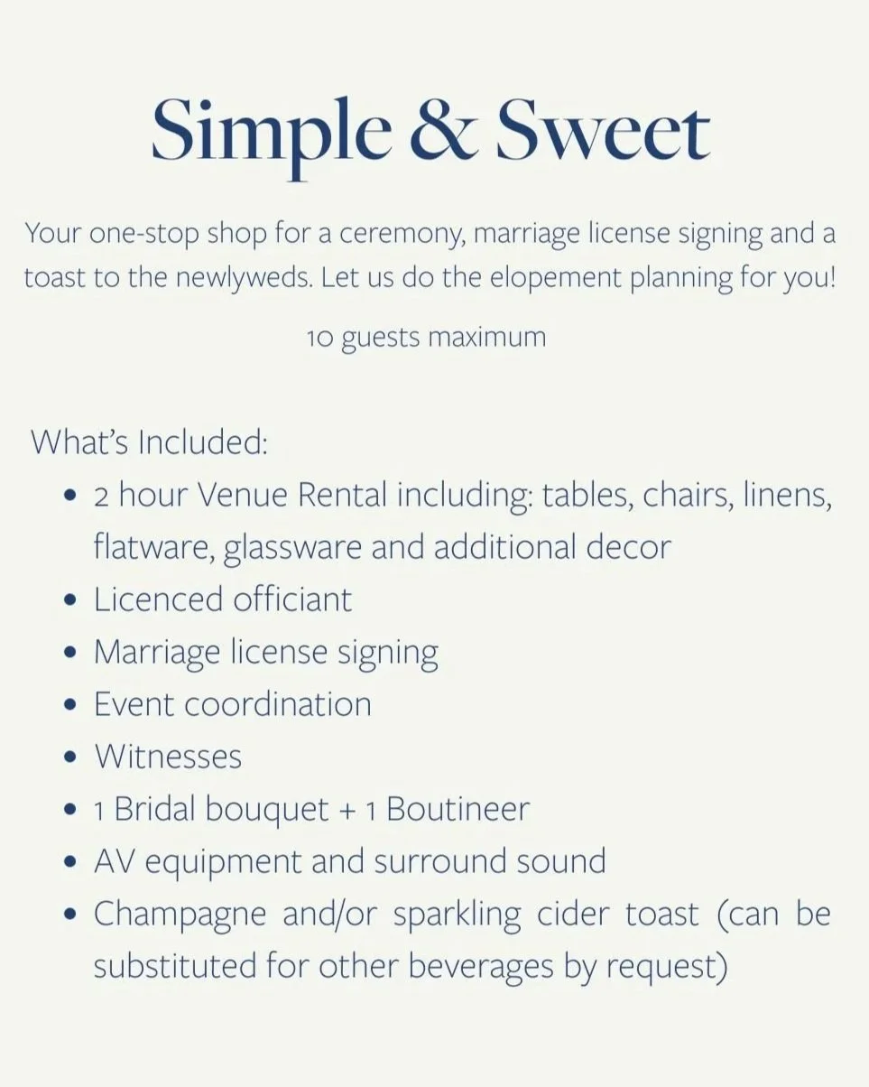 Please note- elopement packages are offered Sunday through Thursday, by availability.